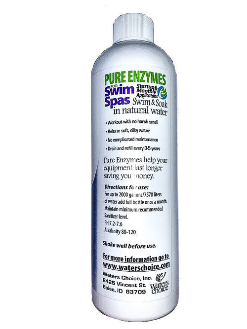 Pure Enzymes for SWIM Spas is a monthly treatment for Swim Spas OVER 1k gallons. Waters Choice enzymes enable you to use less chlorine and eliminate most other harsh chemicals. This is an enzyme treatment designed to maintain your swim spa water with the fewest chemicals possible.