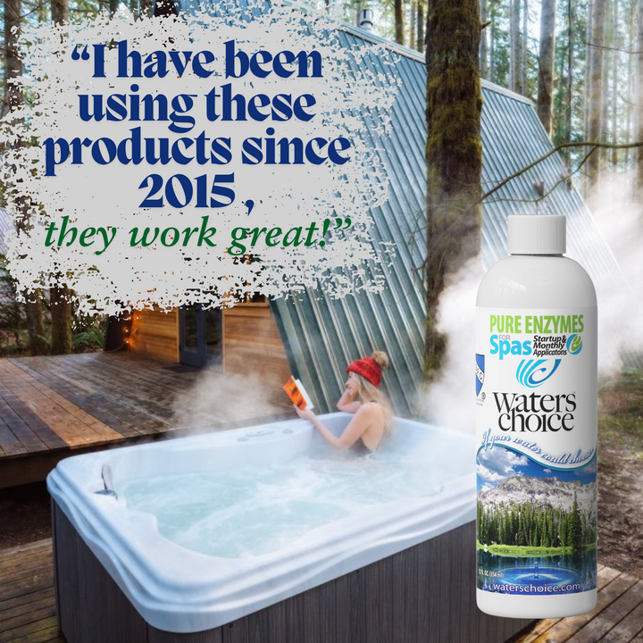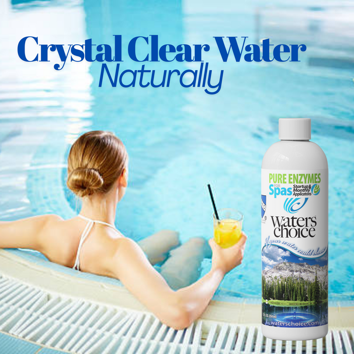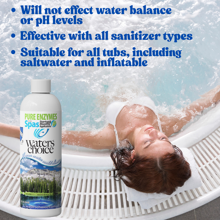 Pure Enzymes for Spas is a monthly spa treatment for up to 500 gallons. Enzymes treat spa water filled with organics like sunscreen, sweat, urine, and debris from plants and trees. These organics put a high demand on chlorine, which means you must increasingly use more. Waters Choice Spa Enzymes will break down the organics in your water, freeing up the chlorine to do what it does best. This allows you to use less chlorine, which is so much better for you and your spa.